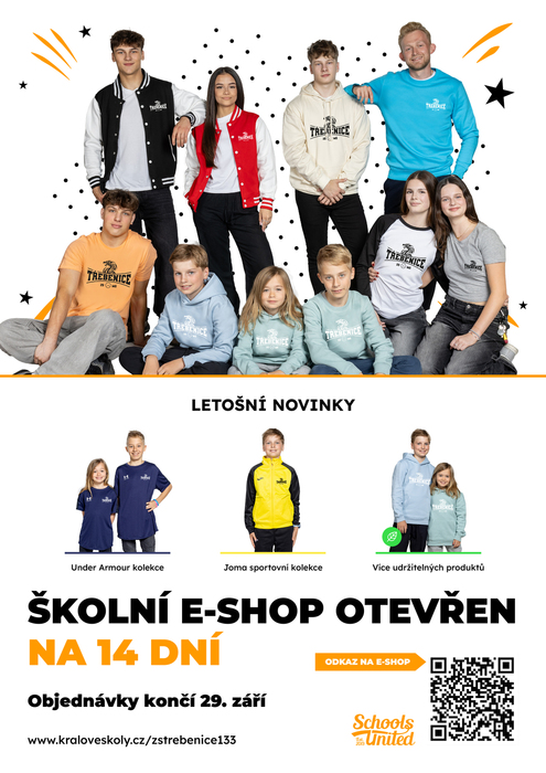 Nechali jsme si jako škola vytvořit vlastní volnočasovou školní kolekci oblečení, jejíž náhled vidíte níže a kterou je možné si aktuálně pořídit na našem e-shopu zde: https://www.kraloveskoly.cz/zs-a-ms-trebenice-parikovo-namesti-133/