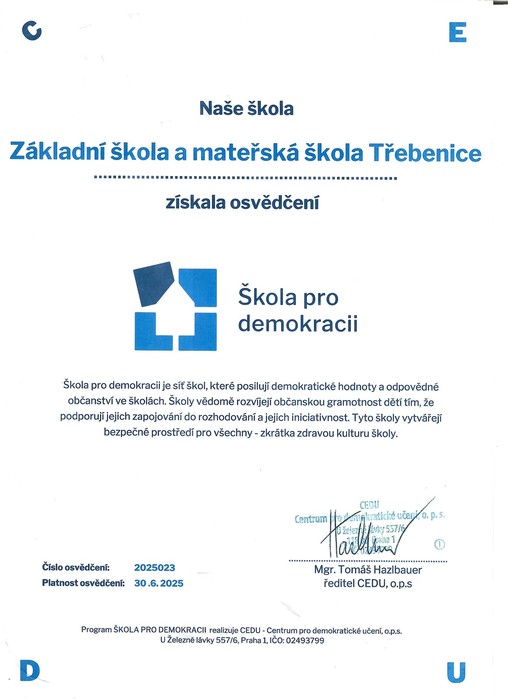 Úvod > Základní škola > Aktuality > Škola pro demokracii - osvědčení