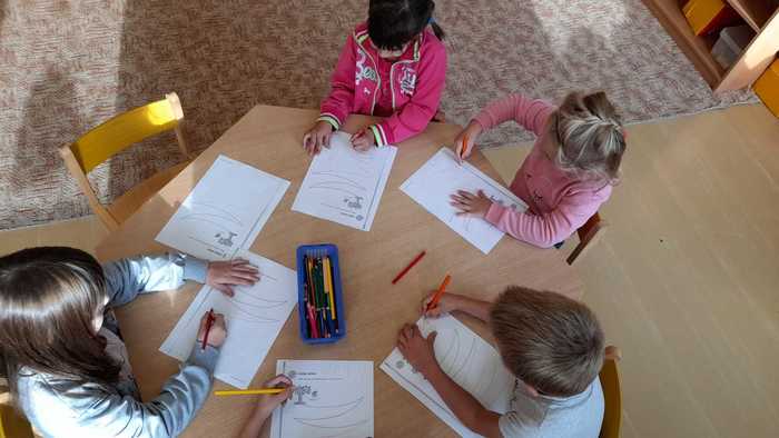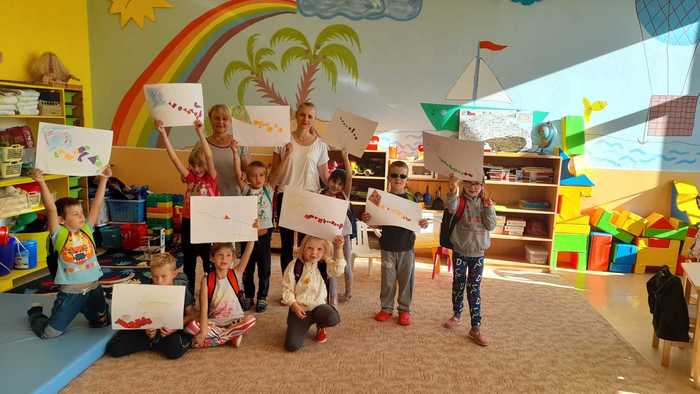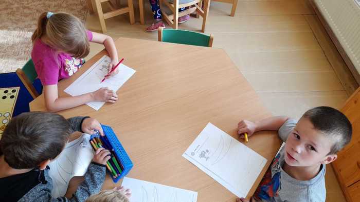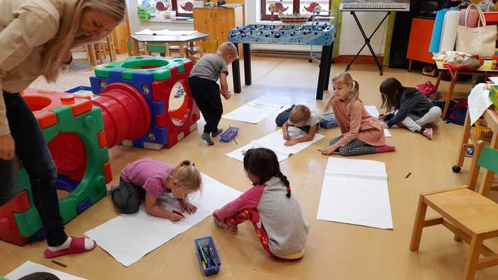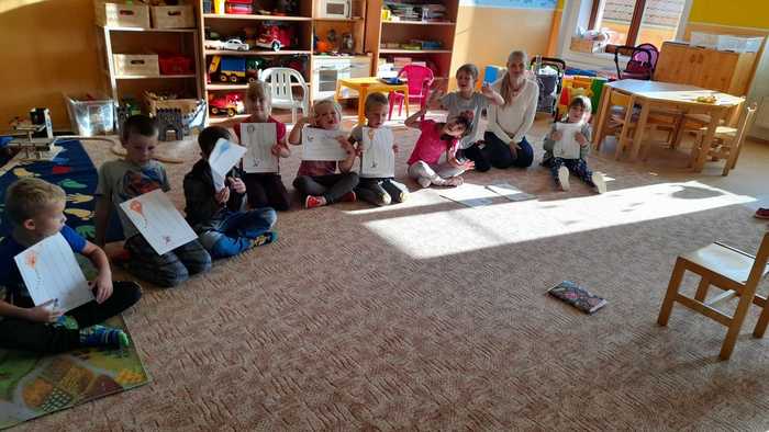 Výroba dráčků (procvičování názvů geometrických tvarů), hry s přírodninami, sestavování stromů z přírodnin a malba stromů na velký formát papíru (grafomotorické cvičení).