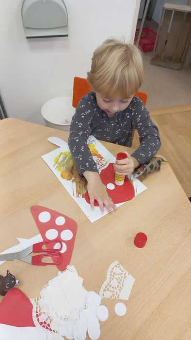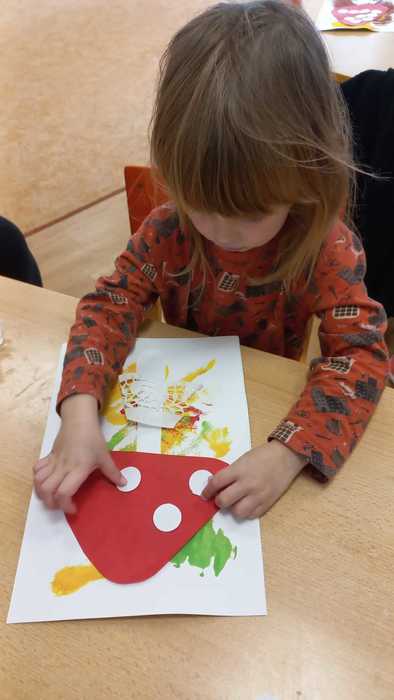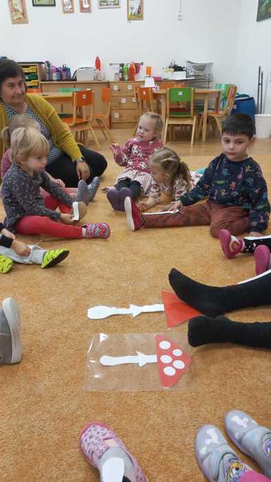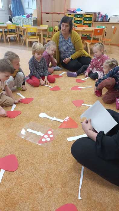 V rámci předmatematických představ děti počítaly tečky na muchomůrce, rozeznávaly a sestavovaly části hub.